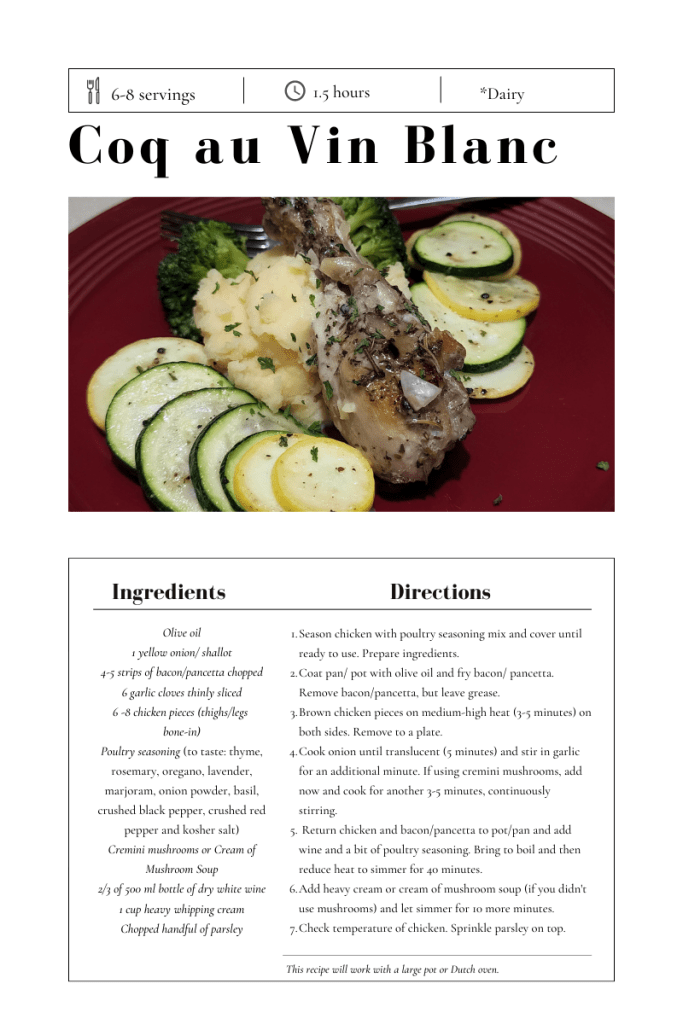 In my household, anytime I find a chicken recipe, it is a must and a save because they love chicken. When I came across coq au vin, I had to give it a go and, of course, a little spin because I am far from being a French chef, no matter how much I enjoy French cooking.