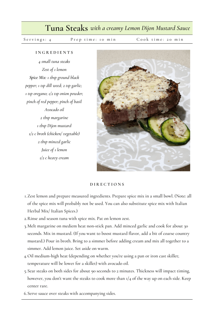 One of the best things about tuna steaks is that while tuna is a heavy for fish, it leaves you full without feeling heavy like your meal is sticking to your bones. A fish jammed pack with flavor and taste, it calls for balancing sides that won’t overpower. Lightly sauteed zucchini and even sour cream mashed potatoes goes well with this main.